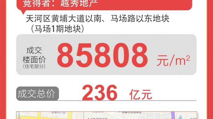 广州土拍总价TOP 2!楼面单价新王! 越秀地产总价236亿元竞得天河区马场1期地块