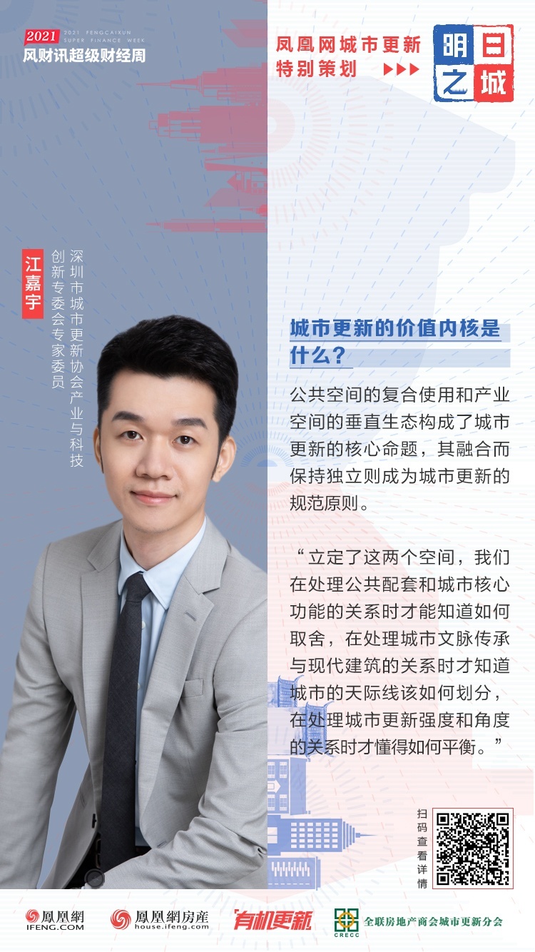 园区和楼宇经济研究学者、产业园区运营专家江嘉宇接受凤凰网房产专访时表示,城市更新,不是简单的拆旧建新,更不是提升城市容积率,容纳更多人的居住,而是通过更具前瞻性和科学性的统筹规划,让城市变得更加宜居宜业和宜游。“说到底,都是为人的生存和发展服务。”
