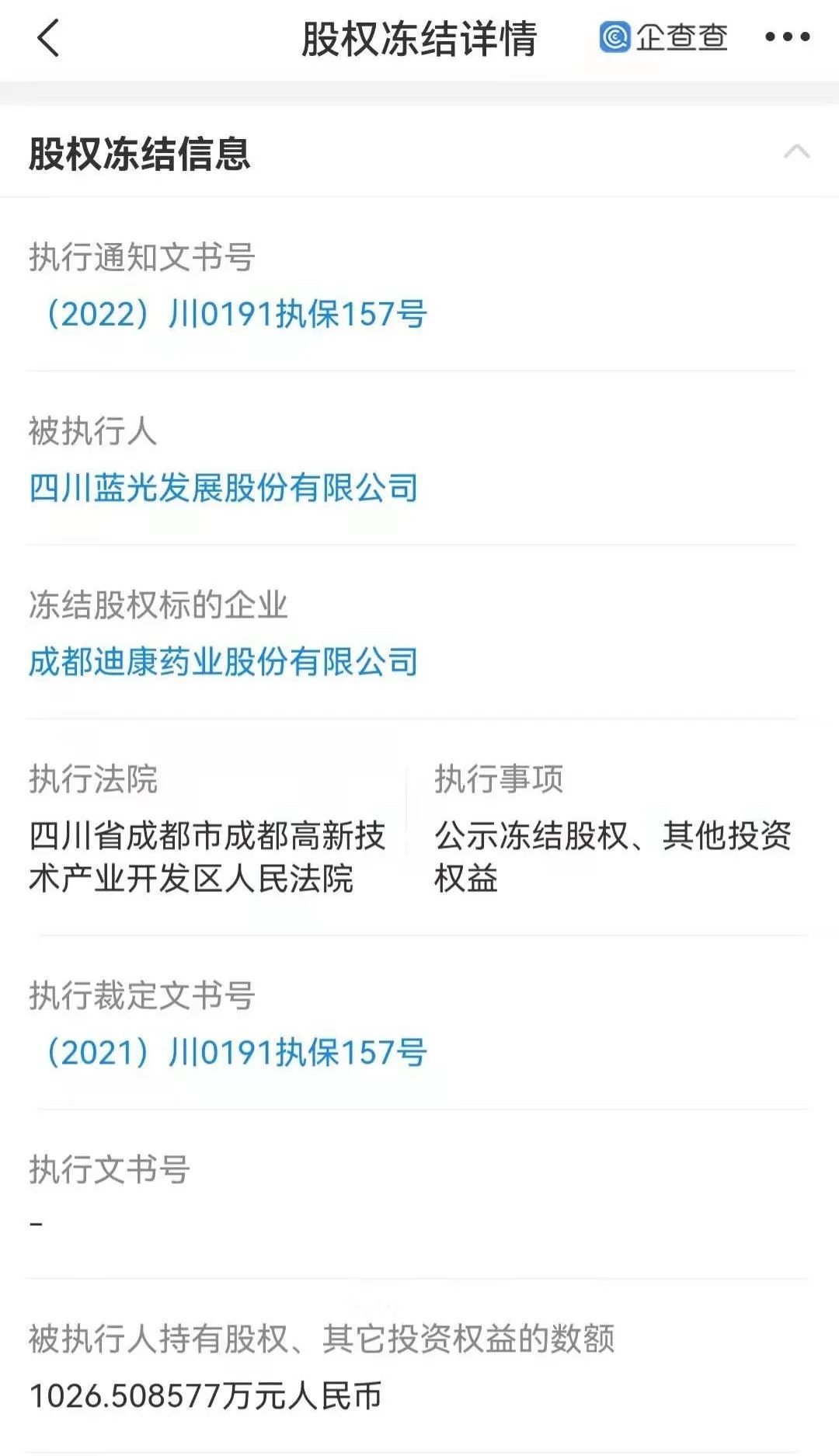 凤凰网风财讯注意到,2月9日,蓝光发展新增了一则执行保全案件。被执行人为四川蓝光发展股份有限公司,冻结股权标的企业为成都迪康药业股份有限公司(下称“迪康药业”),被冻结标的数额为1026.508577万元。