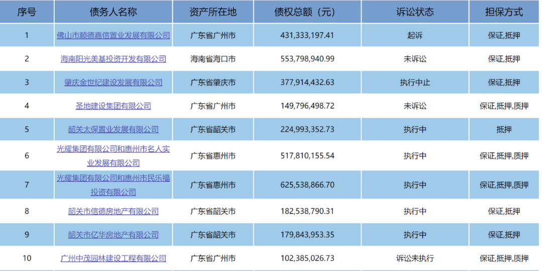 据风财讯统计,长城资产此次推介的房产类资产,债权总额近750亿元,占比超37%。其中包含光耀集团、卓达集团、信德集团等多家知名房企的项目。