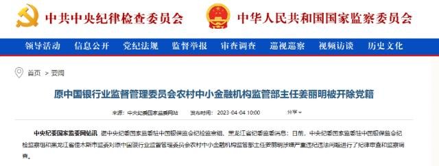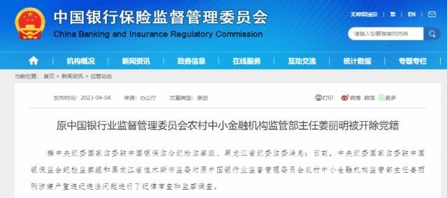 4月4日上午,中央纪委国家监委网站信息显示,原银监会农村中小金融机构监管部主任姜丽明被开除党籍。