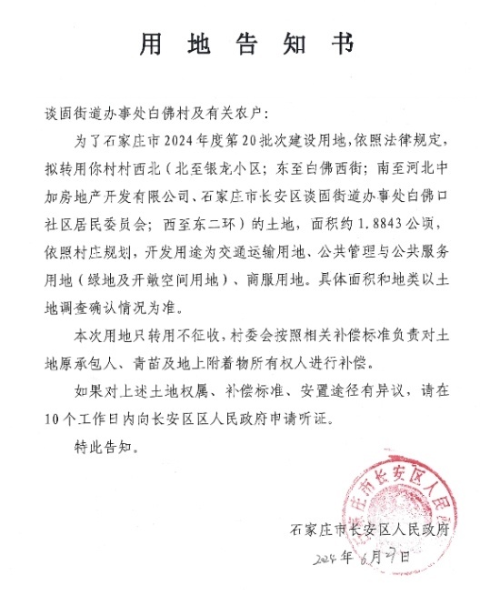 凤凰网房产获悉,长安区政府发布一则用地告知书,为了石家庄市2024年度第20批次建设用地,依照法律规定拟转用白佛村村西北(北至银龙小区;东至白佛西街;南至河北中加房地产开发有限公司、石家庄市长安区谈固街道办事处白佛口社区居民委员会;西至东二环)的土地,面积约1.8843公顷(28.26亩)。依照村庄规划,开发用途为交通运输用地、公共管理与公共服务用地(绿地及开敞空间用地)、商服用地。具体面积和地类以士地调查确认情况为准。
