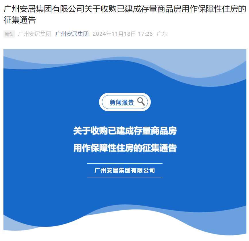 11月18日,广州安居集团发布关于收购已建成存量商品房用作保障性住房的征集通告。通告重点内容提及面向广州全市征集房源,房源为面积90平以下的存量商品房,优先选取整栋或整单元未售、可实现封闭管理的楼栋项目用作保障性住房。