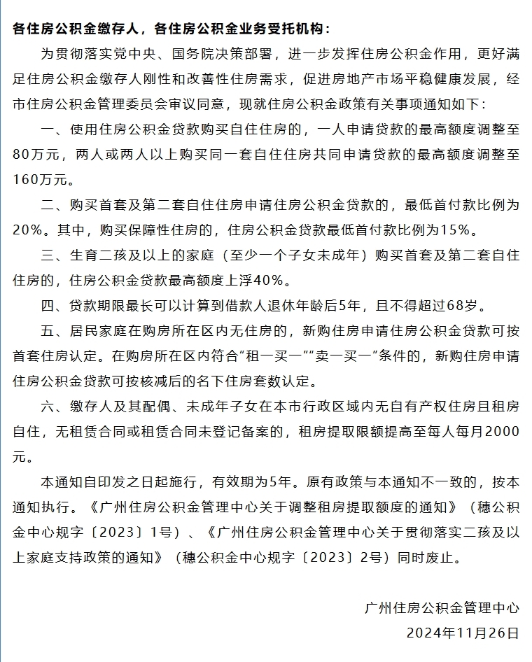 11月26日下午,广州住房公积金管理中心官方微信号发布关于调整住房公积金政策的通知。