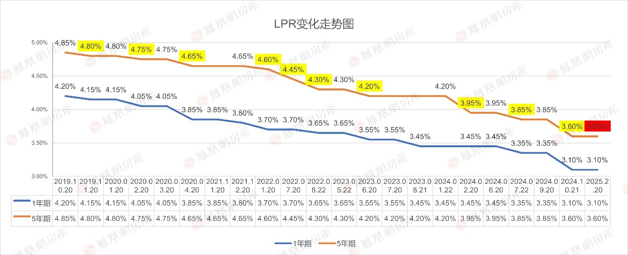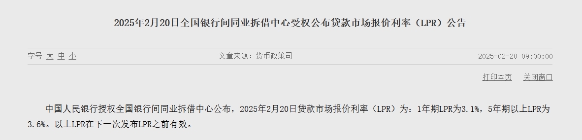 2025年2月20日,中国人民银行授权全国银行间同业拆借中心公布贷款市场报价利率(LPR)为:1年期LPR为3.1%,5年期以上LPR为3.6%,均与上次报价一致。
