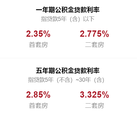 目前,住房公积金贷款利率方面,首套个人住房公积金贷款利率为5年以下(含5年)2.35%、5年以上2.85%,第二套个人住房公积金贷款利率为5年以下(含5年)2.775%、5年以上3.325%。