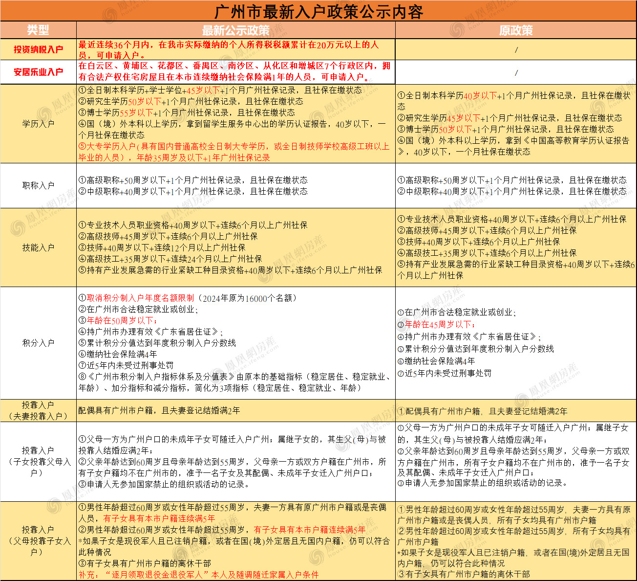 2024年11月18日,广州市发展和改革委员会曾发布关于公开征求《广州市户籍迁入管理规定(修订稿)》意见的公告,涉及内容主要体现在新增白云、黄埔等7个行政区区域购房入户、放宽积分入户申请学历要求至大专及投资纳税入户等,相关政策变化可见下图。