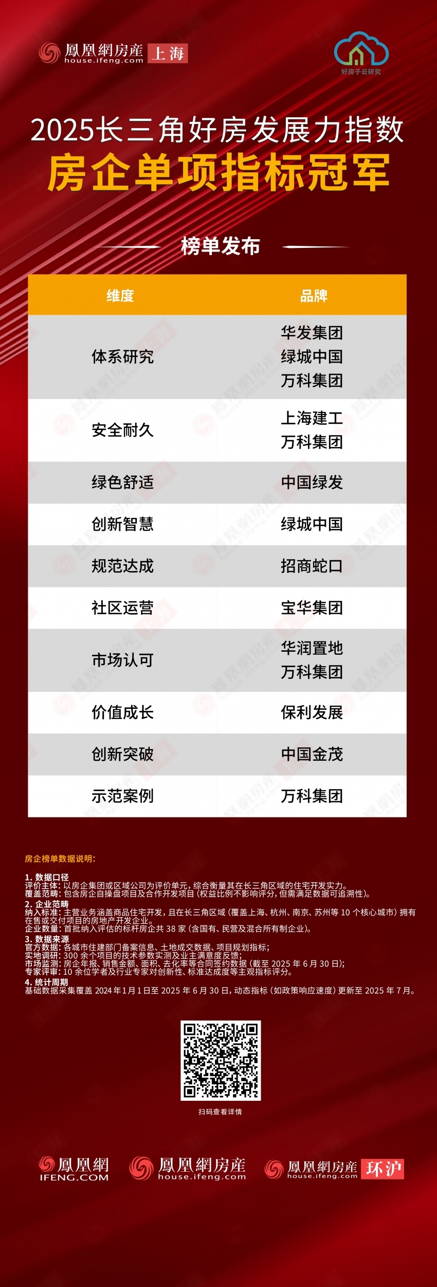 8月1日,《长三角好房发展力城市指数和房企指数》正式发布,首批上榜城市及企业名单揭晓。该指数由凤凰网房产发布,由上海房协好住房云研究院支持,并会同多方行业人士共同编制了指数体系及计算方法。同期发布的第一期《长三角好房发展力指数白皮书》,详细阐释了参与评分的100个具体指标内容及评分案例。