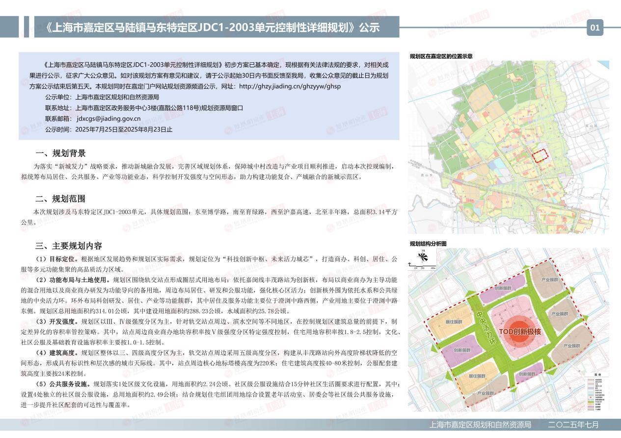 近日,上海市嘉定区马陆镇马东特定区JDC1-2003单元控制性详细规划公示。