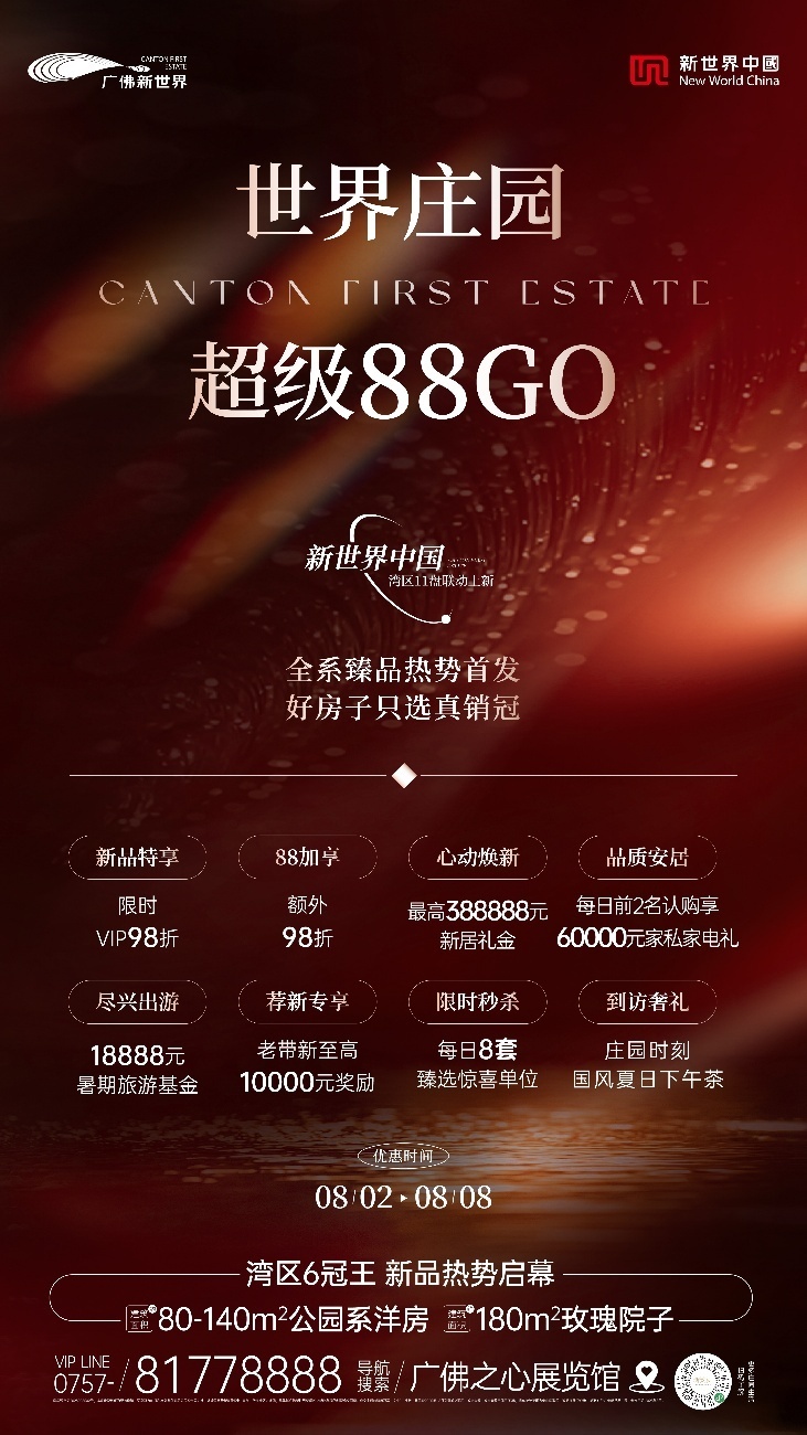 从好房子到好生活,广佛新世界以湾区首席庄园封面作实力领潮粤港澳大湾区。世界庄园·超级88GO,八重超燃豪礼,助力入主湾区好房社区!