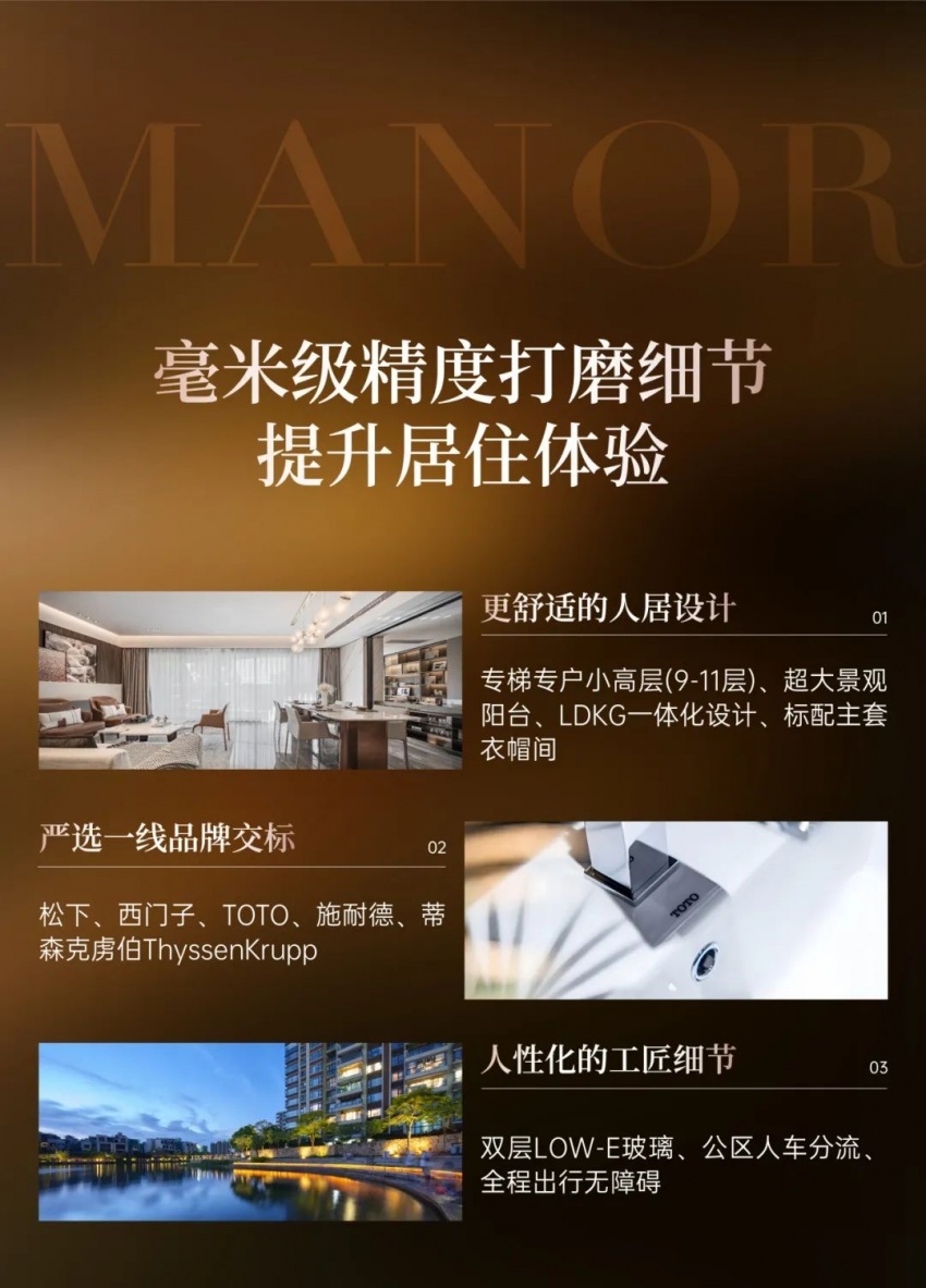 在社区规划上,早早做好公区人车分流,全程出行无障碍设计,在交付标准上,不玩花里胡哨的鸡肋智能化,而是坚持品牌主义,从蒂森克虏伯电梯的静谧运行,到松下新风、TOTO卫浴的细节呵护,每一寸空间皆以高端品牌交标。在广佛新世界,真正的奢侈不仅是大理石的厚度,更是对生活瞬间的极致回应。