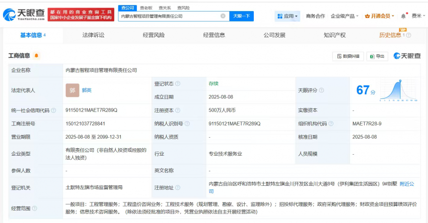 天眼查App显示,近日,内蒙古智程项目管理有限责任公司成立,法定代表人为郭英,注册资本500万人民币,经营范围包括工程管理服务、工程造价咨询业务、工程技术服务等。股东信息显示,该公司由伊利股份(600887)全资持股。