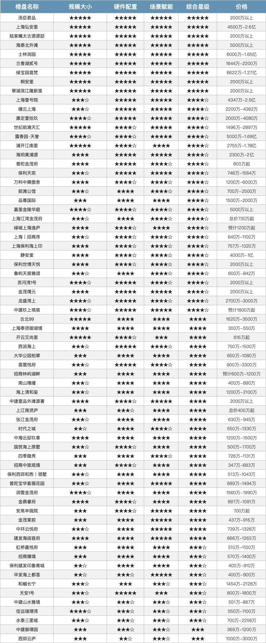 (注:规模大小:根据户均会所面积评级;硬件配置:根据会所的设施配置、设备先进程度等评级;场景赋能:根据会所能满足的生活场景多样性评级;综合星级:基于以上维度的整体评价)