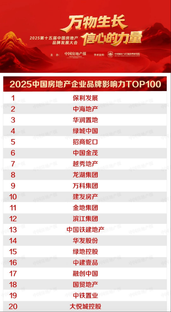 近日,由中国房地产报、中国城市与区域治理研究院主办的“万物生长 信心的力量——2025第十五届中国城市发展及房地产创新大会”在北京召开,会上隆重发布了“2025年中国房地产行业品牌影响力百强榜”,融创中国位列民营房企前三名。