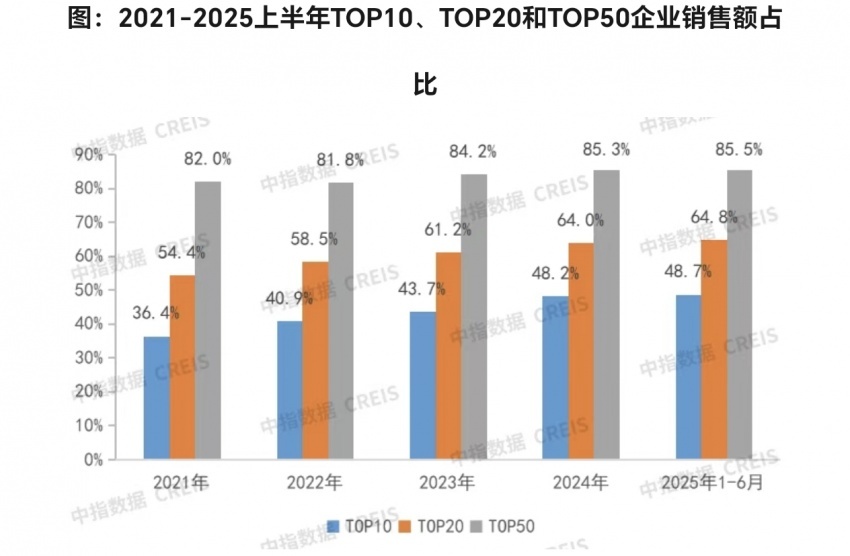 凤凰网风财讯报道 “强者愈强”的格局在2025年的房企竞争中越发显著。中指研究院数据显示,2025上半年,TOP50企业已占据百强销售额的85.5%,尤其TOP10的销售额占比达到48.7%,且较2024年进一步提升0.5个百分点。