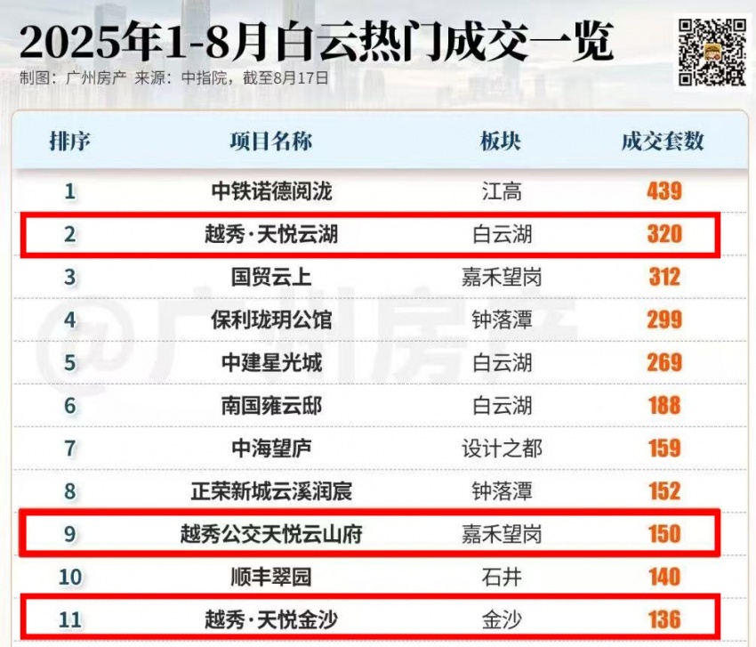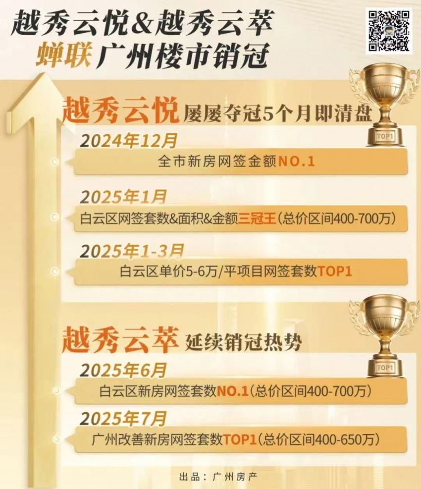 天悦云湖2025年上半年劲销400套,销售额超15亿元,一举拿下白云湖板块销冠,凭一己之力拉升了整个板块的价格预期和销售流速;云悦5个月火速清盘,云萃首推105套上演“3人抢1房”盛况,“开盘即罄”成为产品力的有力证明;越秀公交·天悦云山府以扎实的交付品质稳居板块销售第一,兑现国企承诺;越秀·天悦金沙稳坐金沙洲板块“三冠王”,稀缺的湖山现楼魅力无法阻挡。