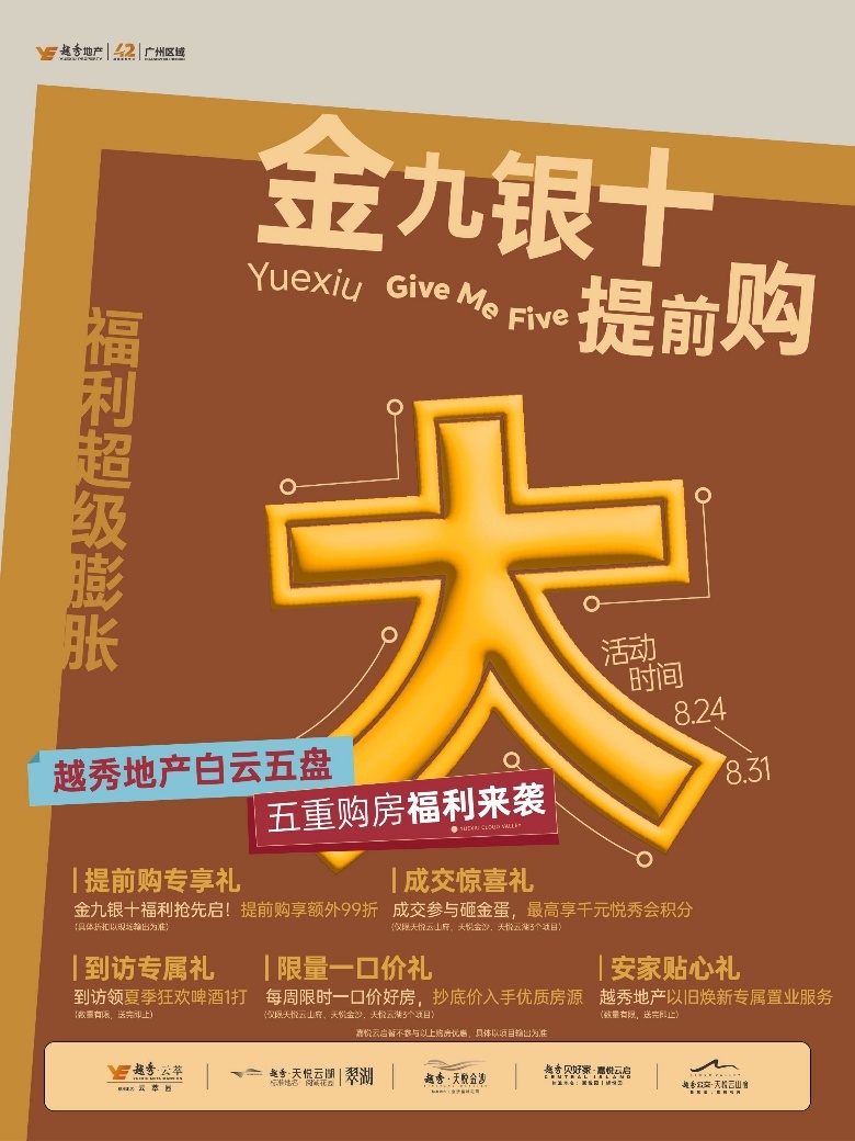 当白云的城市价值持续攀升,当越秀地产的产品力与兑现力有目共睹,这个8月,越秀地产于白云的五大热盘联动推出金九银十置业优惠,无疑是“上车主城”的最佳时机。从湖居到山景,从TOD到中轴,无论是首次置业的刚需,还是追求品质的改善,都能找到心仪之选。