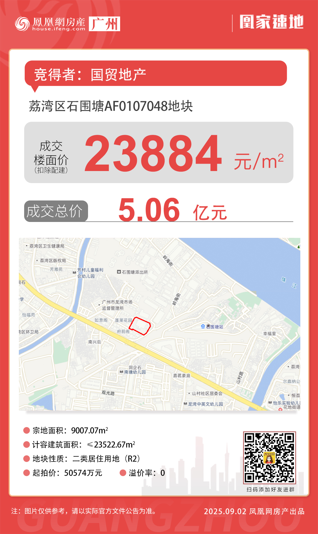 9月2日10时,荔湾区石围塘AF0107048地块进行限时竞拍,由广州国贸房地产有限公司以总价5.06亿元竞得,扣除配建后,折合楼面价为23884元/平。