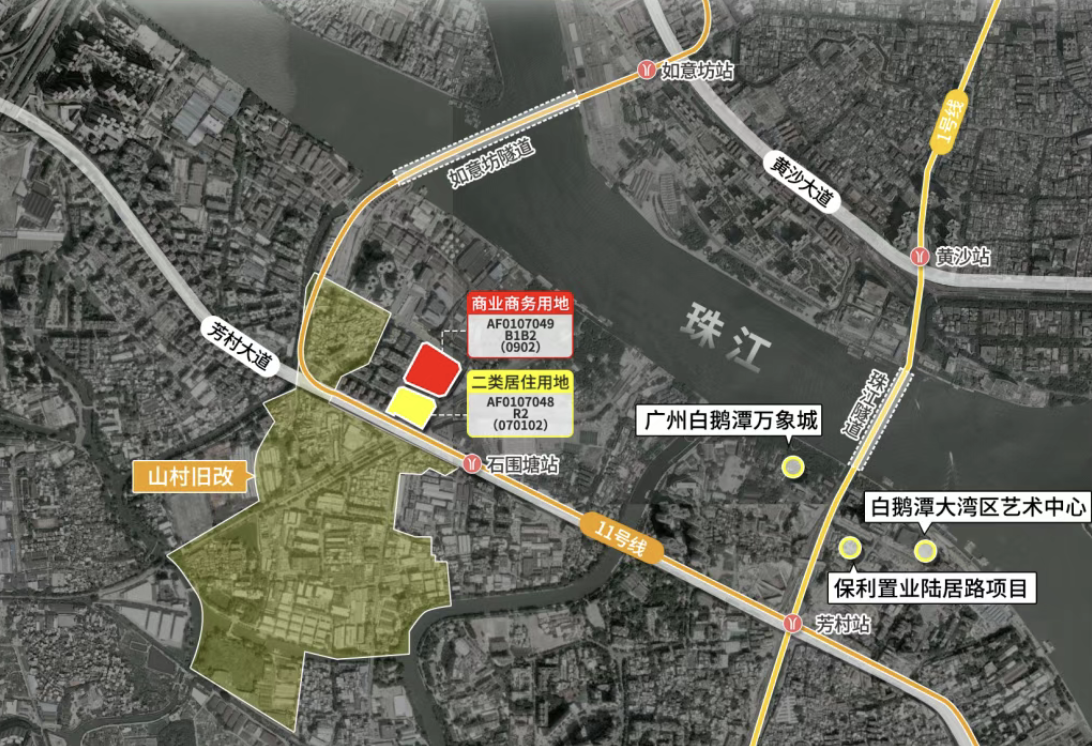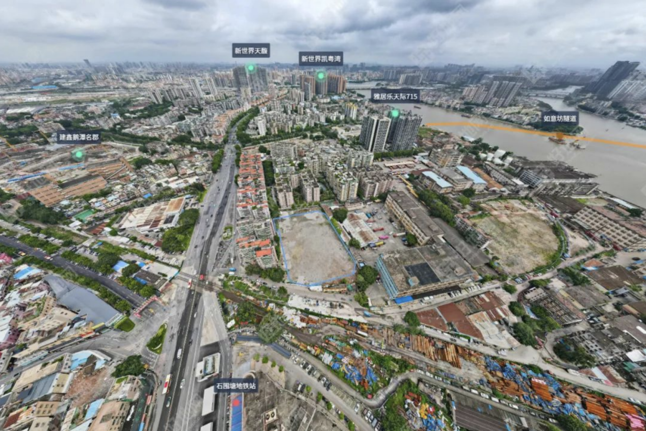 该地块附近在售项目有新世界凯粤湾(2025年7月带装修一手住宅均价43000元/㎡)、万科理想花地傲(2025年7月带装修一手住宅均价50000元/㎡)等住宅小区。