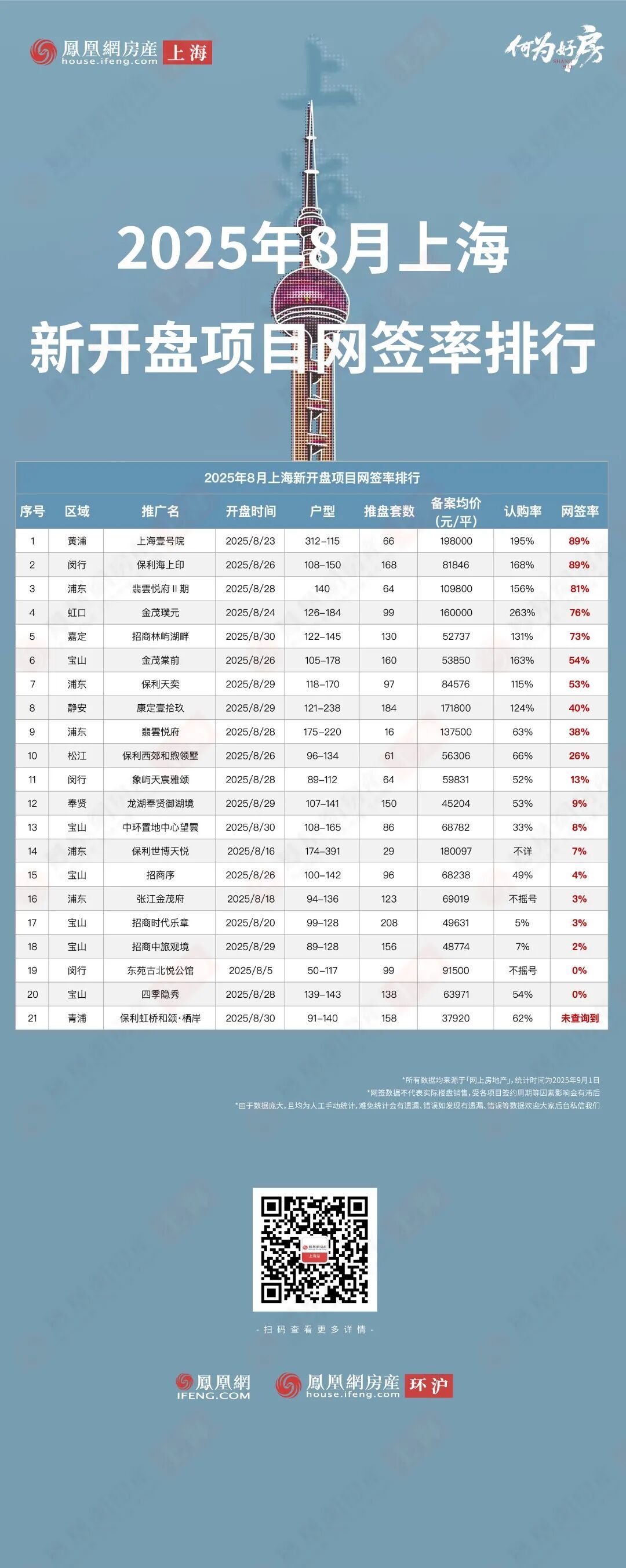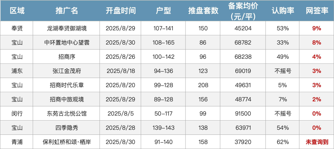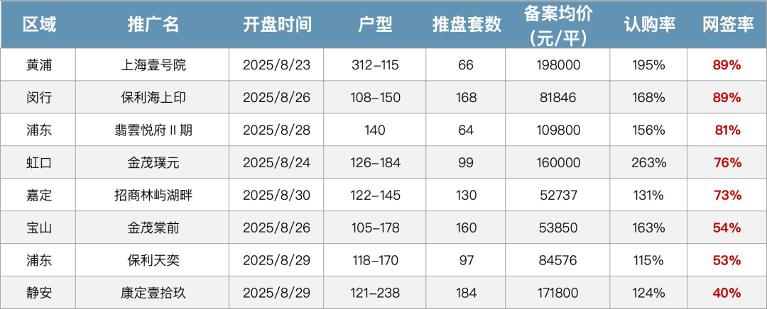 即便如此,仍有部分项目表现亮眼。例如,上海壹号院于8月23日开盘,推出66套房源,开盘当日即实现100%去化,截至9月1日网签率达89%;保利海上印于8月26日入市,推出168套高层房源,网签率同样达到89%。
