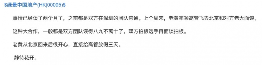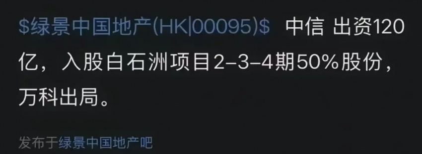 风财讯:近日在绿景中国地产股吧流传多个消息称,中信集团旗下中信城开拟出资120亿元入股绿景中国地产(HK00095)白石洲项目2-3-4期50%股份。