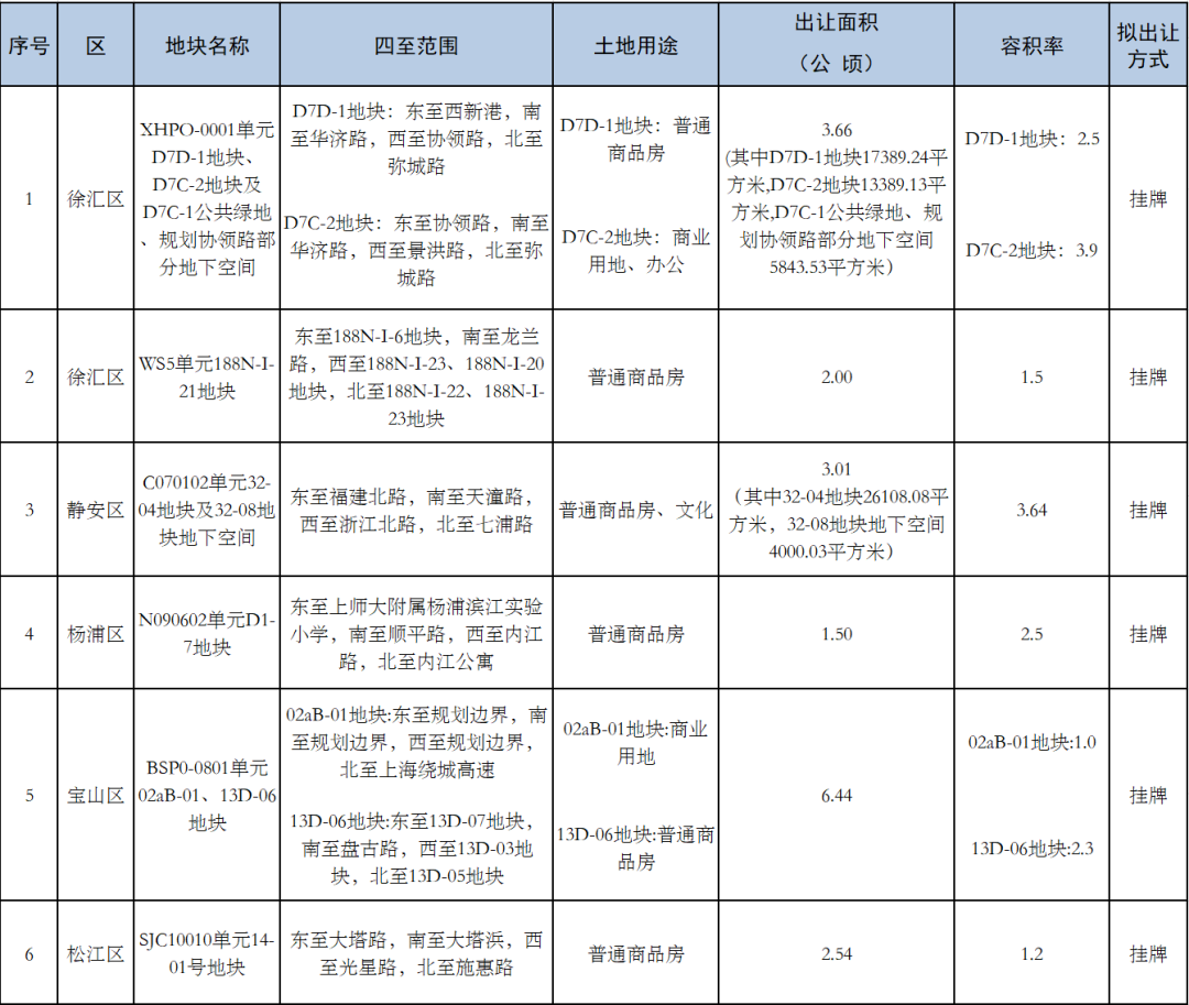 来自徐汇滨江、徐汇华泾、静安苏河湾、杨浦滨江、宝山杨行与松江新城的6幅涉宅用地正式上架待拍。
