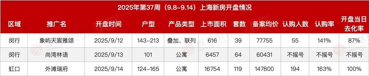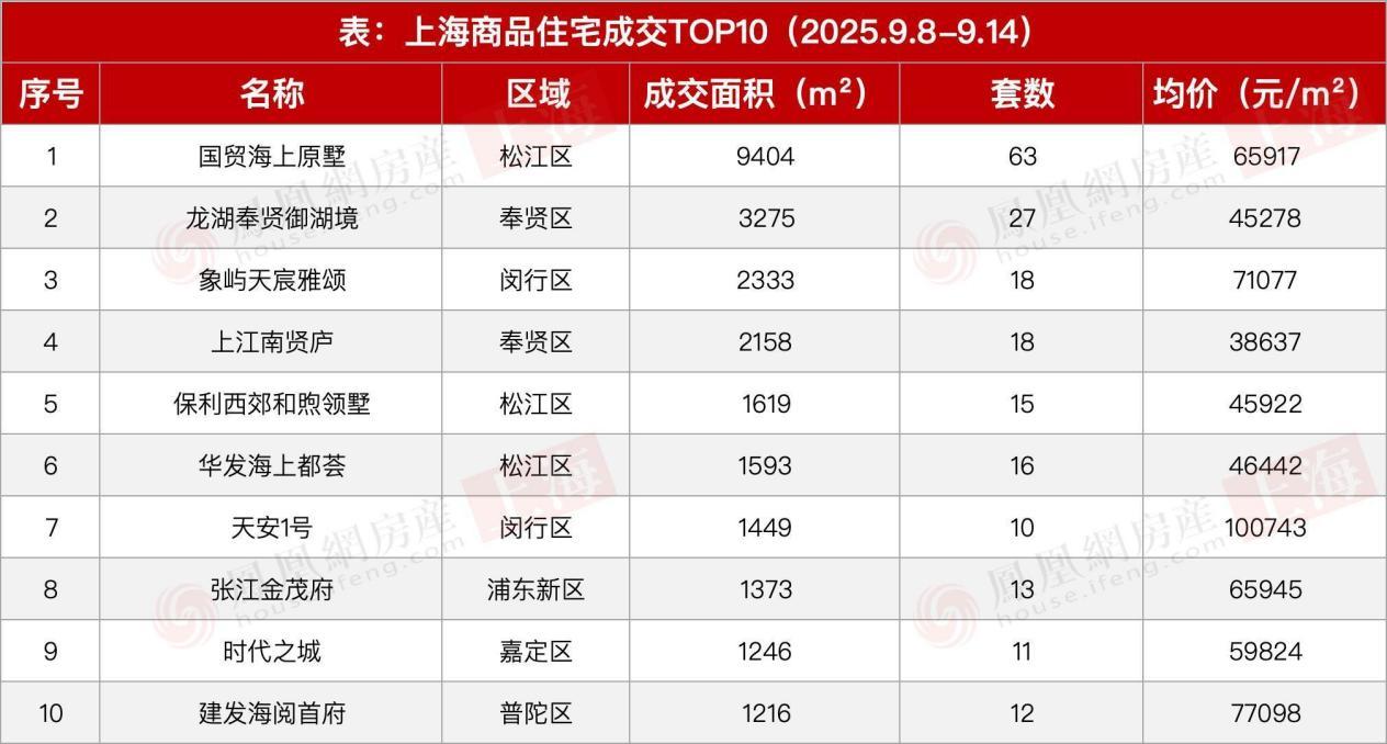 其中,位于松江新城板块的国贸海上原墅位列成交榜首,上周共网签63套,成交面积9404平方米,网签均价65917元/平方米。该项目于9月7日开盘,推出146套房源并于当日全部售罄。