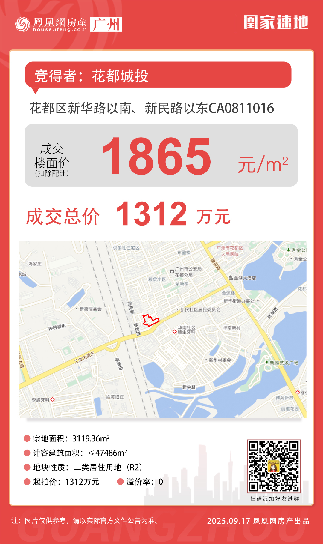 9月17日10时,花都区新华路以南、新民路以东CA0811016地块进行限时竞拍,由广州市花都区睿城投资有限公司,归属花都城投,以总价1312万元竞得,扣除配建后,折合楼面价为1865元/平。