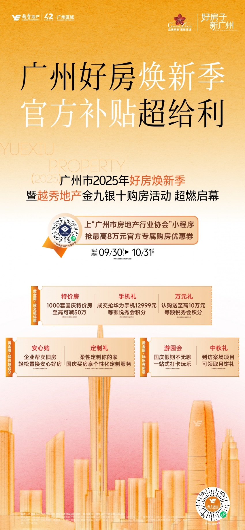 为迎接金九银十,越秀地产买好房活动超燃启幕。国庆中秋双节期间,越秀地产广州区域开启 “保价护航” 国庆置业活动,以 “保价格、保品质、保交付” 三保承诺为购房者筑牢安心基础,同步叠加 “官方购房券” 双重厚礼,有置业需求的购房者们,不妨趁此良机,前往现场,抢占一份穿越周期的安心和兑现品质人居的美好契机!