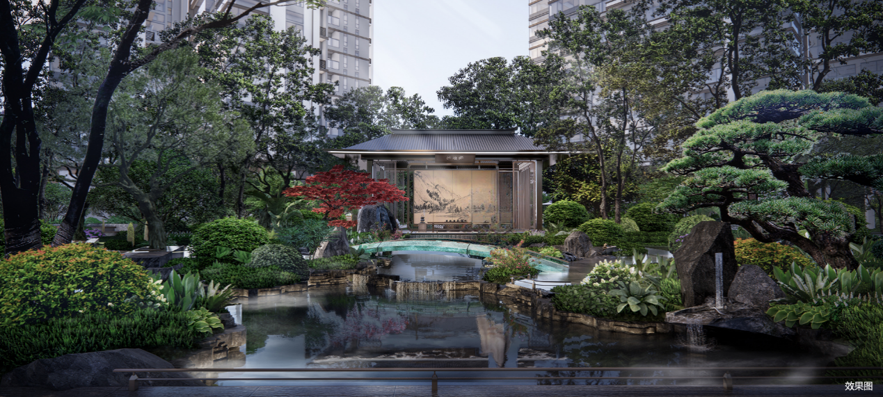 西区园林是本次产品的重要亮点之一。设计团队以岭南四大名园之首清晖园为蓝本,传承其“翰林文脉,世家风骨”的造园理念,将传统“前庭后院”礼序格局融入现代生活场景,形成“一轴一心一环”的结构骨架与“山水六境”诗意景观动线。