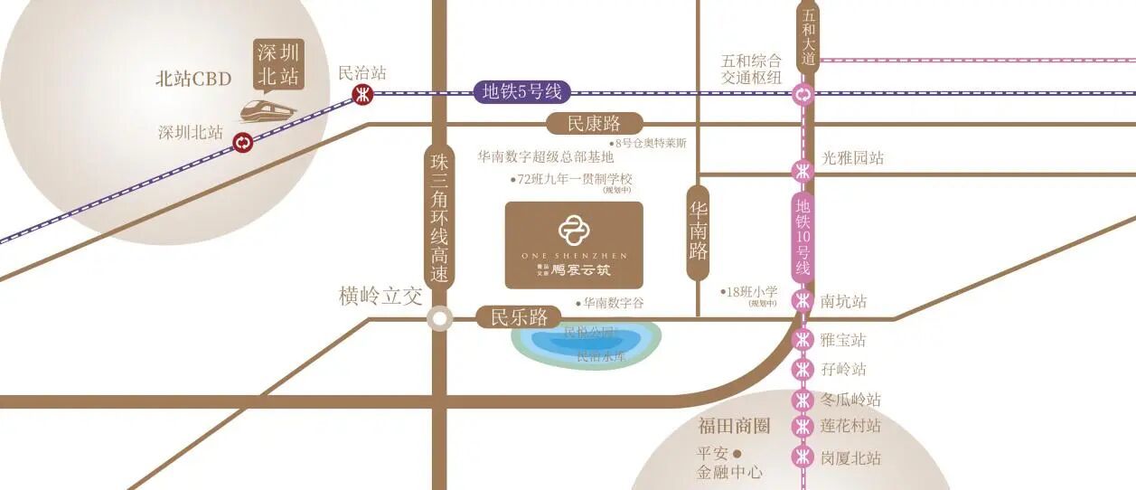 交通方面,项目周边汇聚深圳地铁4号线、5号线、6号线、10号线,以及建设中的22号线与27号线共6条线路。距10号线南坑站直线距离约600米,2站可达福田,4站直达深圳北站,轻松换乘通往南山、前海、宝中等核心区域。
