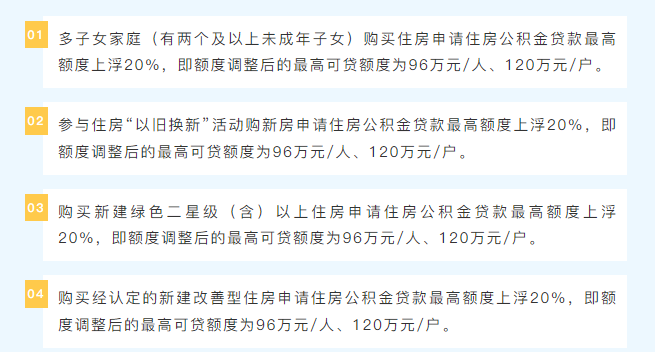 提高住房公积金贷款最高额度。单缴存人的住房公积金贷款最高额度由50万元/人提高至80万元/人。家庭(夫妻双缴存人)的住房公积金贷款最高额度仍为100万元/户。