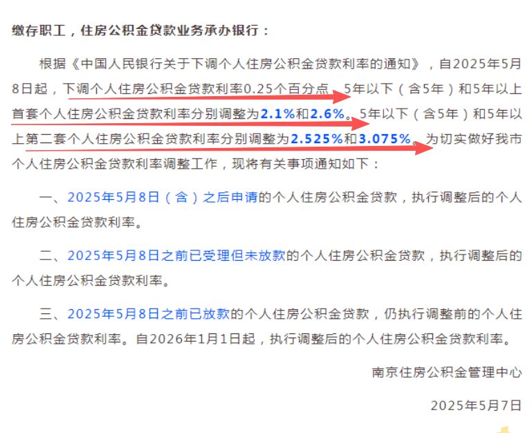 5月7日,南京住房公积金管理中心发布了利率调整通知。