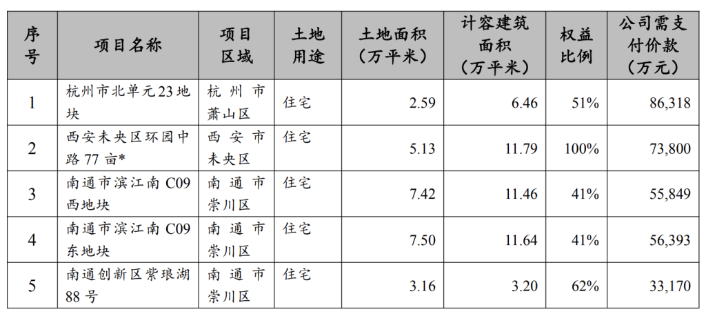 其中,杭州市北单元23地块位于杭州市萧山区,土地面积2.59万平方米,计容建筑面积6.46万平方米,需支付价款86318万元,权益比例为51%。