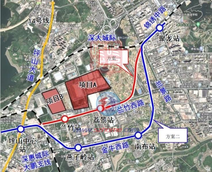 方案一(建设规划方案)在坪山综合保税区沿兰竹西路敷设,距离项目A和项目 B 最近距离最近200m,企业生产微振环境要求高,根据与相 关产权单位函件沟通结果,此方案不满足企业生产微振要求;线路贯穿保税区,对燕子湖重点发展片区、萨米医院等重大公共设施的覆盖服务不足。