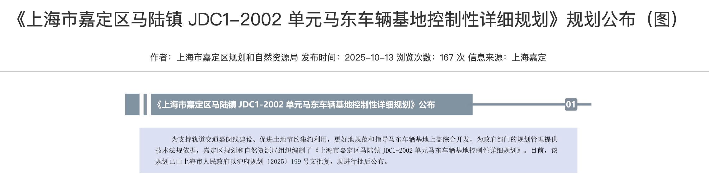 10月13日,《上海市嘉定区马陆镇 JDC1-2002 单元马东车辆基地控制性详细规划》正式对外发布,明确了该区域未来发展的整体框架与功能布局。