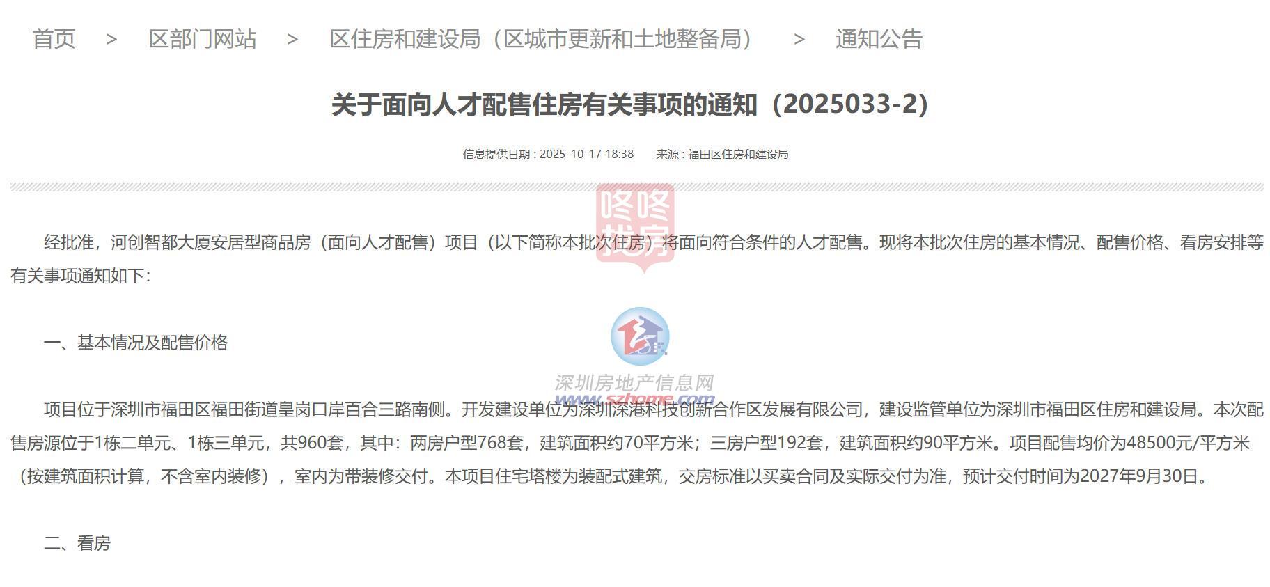 10月17日,福田住建发布关于面向人才配售住房有关事项的通知(2025033-2)。