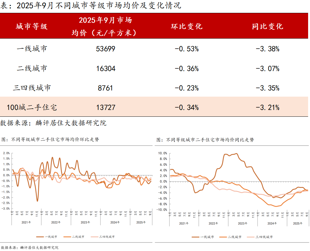 报告显示,9月一线城市市场均价为53699元/平方米,环比下跌0.53%,同比下跌3.38%。二线城市市场均价为16304元/平方米,环比下跌0.36%,同比下跌3.07%。三四线城市市场均价为8761元/平方米,环同比分别下跌0.23%、3.35%。