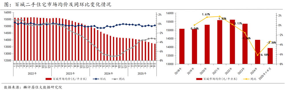 前三季度,100个重点城市房价为13943元/㎡,较2024年下跌3.36%,较2024年6.18%的跌幅收窄2.81个百分点。截至9月,百城二手房价格环比连续下降31个月,同比连续下降33个月。