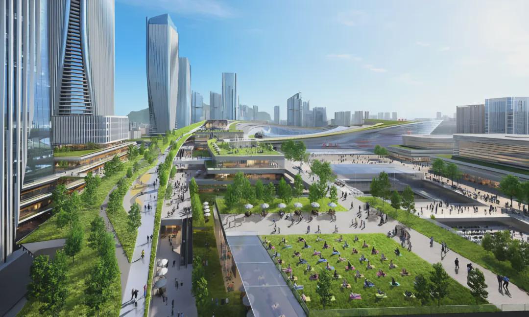 对标“15分钟社区生活圈”,西丽高铁新城除了“站城和谐、公交优先”的综合交通总体规划思路,还将体现“绿网缝合、慢行互联”策略,缝合枢纽南北片区,通过连续的慢行廊道拉近高新区、留仙洞等周边区域的空间距离。规划地面、空中立体慢行网络,衔接轨道站点、公园与公共空间,构建5分钟见绿的。重点打造枢纽北侧站前广场、西侧带状公园等城市客厅,提供全天候开放的公共活动场所,促进“站-产-城”融合与公众共享。