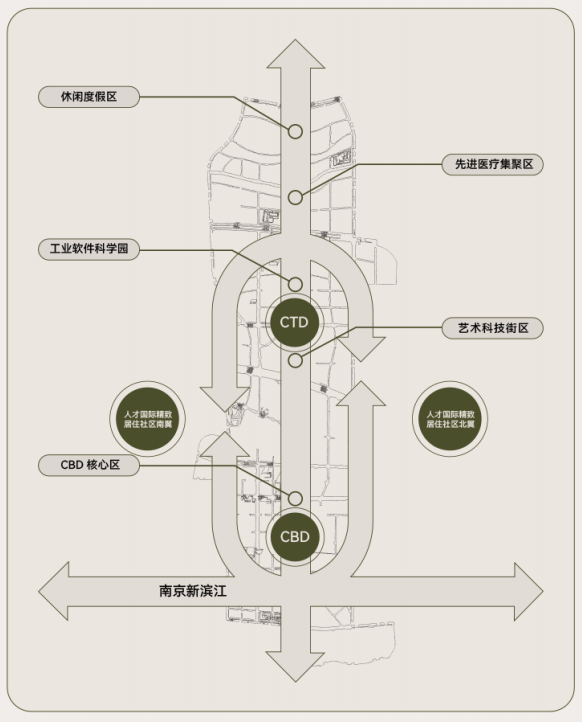 今年6月,定山大街CTD城市发展轴正式发布:江北核心区3.1km²中央科创区与2.4km²中央商务区串联为一条金脉,将沿定山大街布局CBD核心区、艺术科技街区、工业软件科学园、先进医疗集聚区、休闲度假区五个片区,与“两翼”人才国际精致居住社区联动,共同促进产城融合发展。(信息来源南京市江北新区官网)