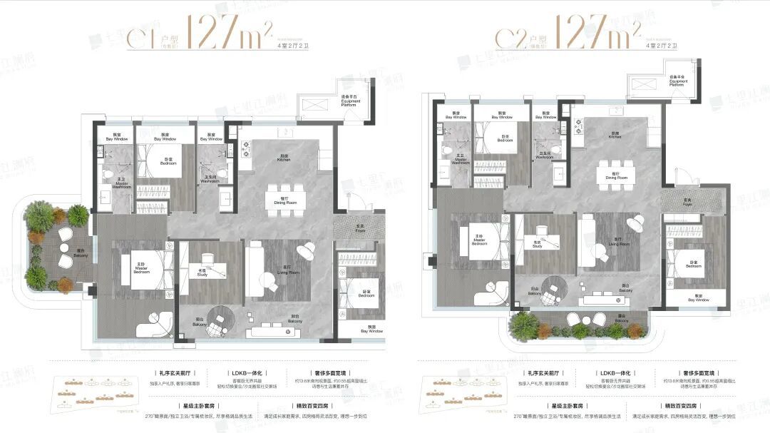 建面约127㎡四室两厅两卫,四开间朝南,约13.6米南向观景面,约0.55超高窗墙比诗意与生活兼蓄并存,拥有超乎想象的采光与观景面。