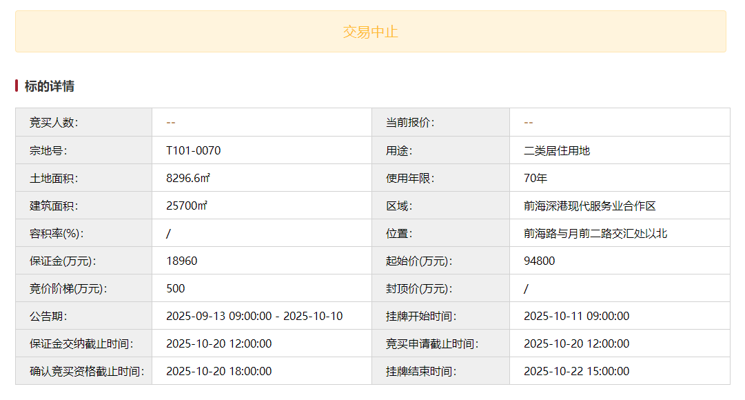 今日(10月20日),深圳交易集团有限公司发布公告,中止原定于10月22日出让的前海妈湾T101-0070宗地。