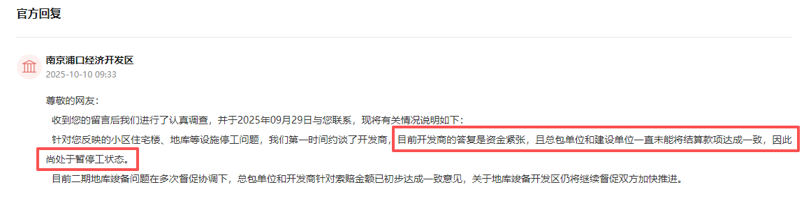 2025年10月10日,南京浦口经济开发区针对此网友的投诉给出相关回复,“针对您反映的小区住宅楼、地库等设施停工问题,我们第一时间约谈了开发商,目前开发商的答复是资金紧张,且总包单位和建设单位一直未能将结算款项达成一致,因此尚处于暂停工状态。”