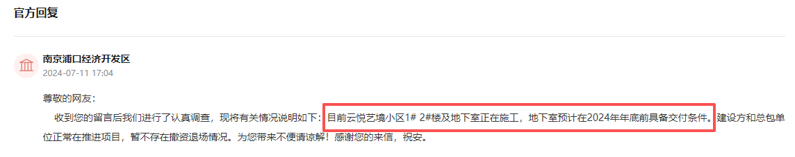 2024年7月,当时的官方回复是:小区1# 2#楼及地下室正在施工,地下室预计在2024年年底前具备交付条件。建设方和总包单位正常在推进项目,暂不存在撤资退场情况。