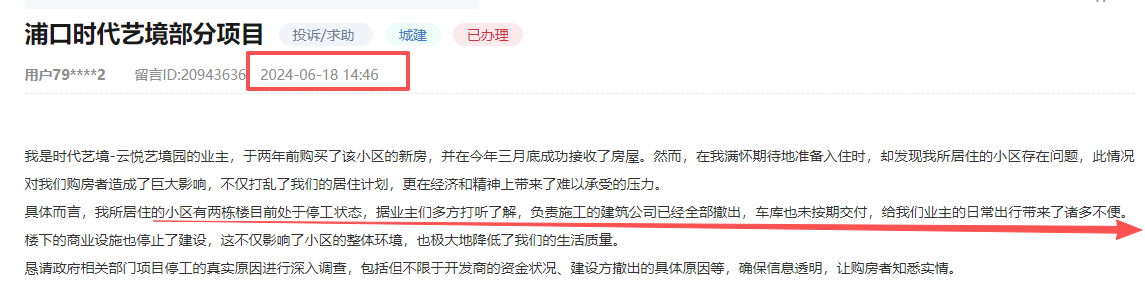 2024年11月,又有业主表示:时代艺境一期和二期各自有两栋楼没有工人干活,一直荒着,导致二期南大门、一期和二期楼下的商业都没有办法交付。