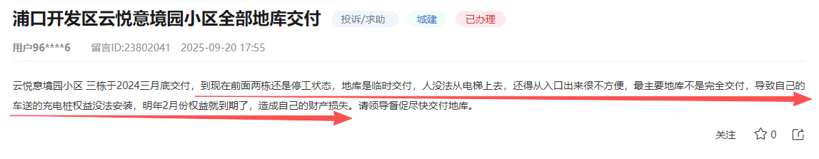 近日,有网友在人民网领导留言板上反映:“云悦艺境园于2024年3月底交付,到现在小区内还有两栋楼是停工状态,地库是临时交付,人没法从电梯上去,得从入口出来很不方便。最主要地库不是完全交付,导致自己的车送的充电桩权益没法安装,明年2月份权益就到期了,造成自己的财产损失。请领导督促尽快交付地库。”