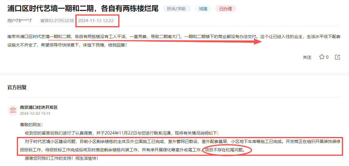 当时的官方回复是:对于时代艺境小区建设问题,目前小区剩余楼栋的主体及外立面施工已完成、室外管网已敷设、室外配套基层、小区地下车库等施工已完成。开发商正在组织开展装饰装修招投标工作,待招投标工作完成后将及时推进剩余楼栋内装工作,并有序开展绿化等室外收尾工作,项目不存在烂尾问题。
