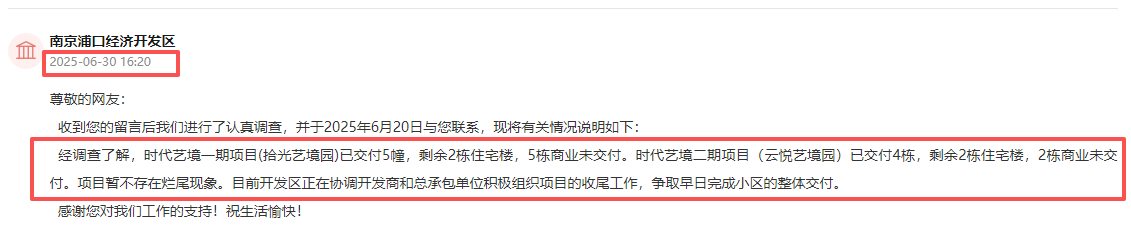 2025年6月,官方再次表示:“时代艺境一期项目(拾光艺境园)已交付5幢,剩余2栋住宅楼,5栋商业未交付。时代艺境二期项目(云悦艺境园)已交付4栋,剩余2栋住宅楼,2栋商业未交付。项目暂不存在烂尾现象。目前开发区正在协调开发商和总承包单位积极组织项目的收尾工作,争取早日完成小区的整体交付。”