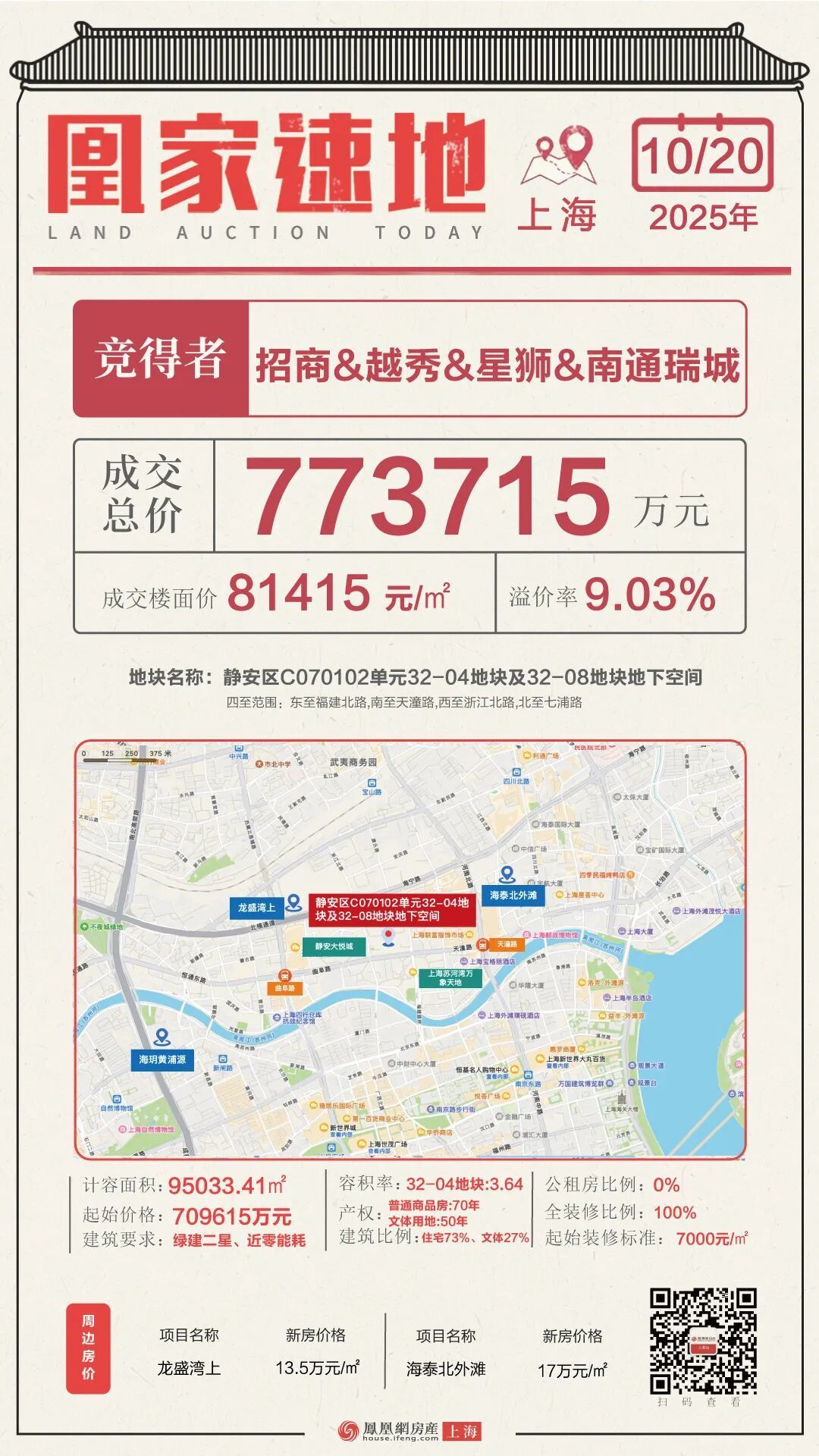 经过52轮激烈竞价,最终由招商&越秀&星狮&南通瑞城以总价773715万元成功竞得,成交楼面价81415元/平方米,溢价率为9.03%。
